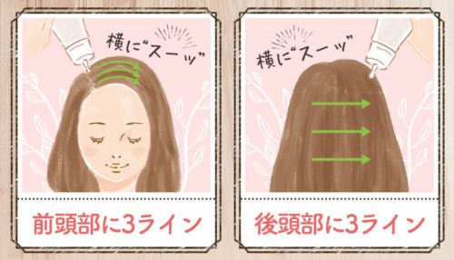 まずは頭の前から頭頂部にかけて、三本線を引くように塗布しましょう。その際、手ぐしで髪を分けることで、髪に液体がついてベタつくことなく、頭皮にしっかり塗布することができます。次に、頭の後ろ側も同じように三本横線を引くようにするのがコツです。