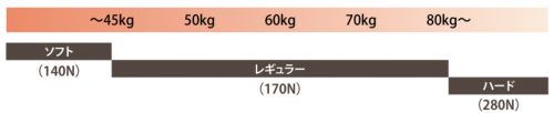 硬さは「ソフト(140N)」「レギュラー(170N)」「ハード(280N)」の3種類。硬さの値はN(ニュートン)で表しますが、ソフトとレギュラーは30Nしか差がないのに対し、ハードはレギュラーと110Nもの差があります。