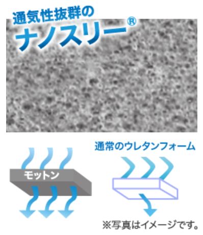 モットンのクッション材には、石油を発泡させて作る「ウレタンフォーム」が採用されています。略して「ウレタン」と呼ばれることの多い素材で、綿や羊毛と違ってダニや雑菌が住み着きにくいのが特徴です。通気性が良いのでホコリも溜まりにくく、衛生的に使うことができます。