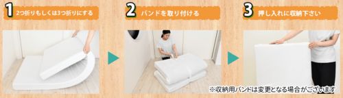 高反発マットレスは、折ったり巻いたりが難しいように見えますよね。モットンには簡単に収納できるように、収納バンドが付属しています。三つ折りに束ねられるので、押し入れにも簡単に収納できますよ。ちなみに、三つ折りにした時の高さは約35cm程度です。