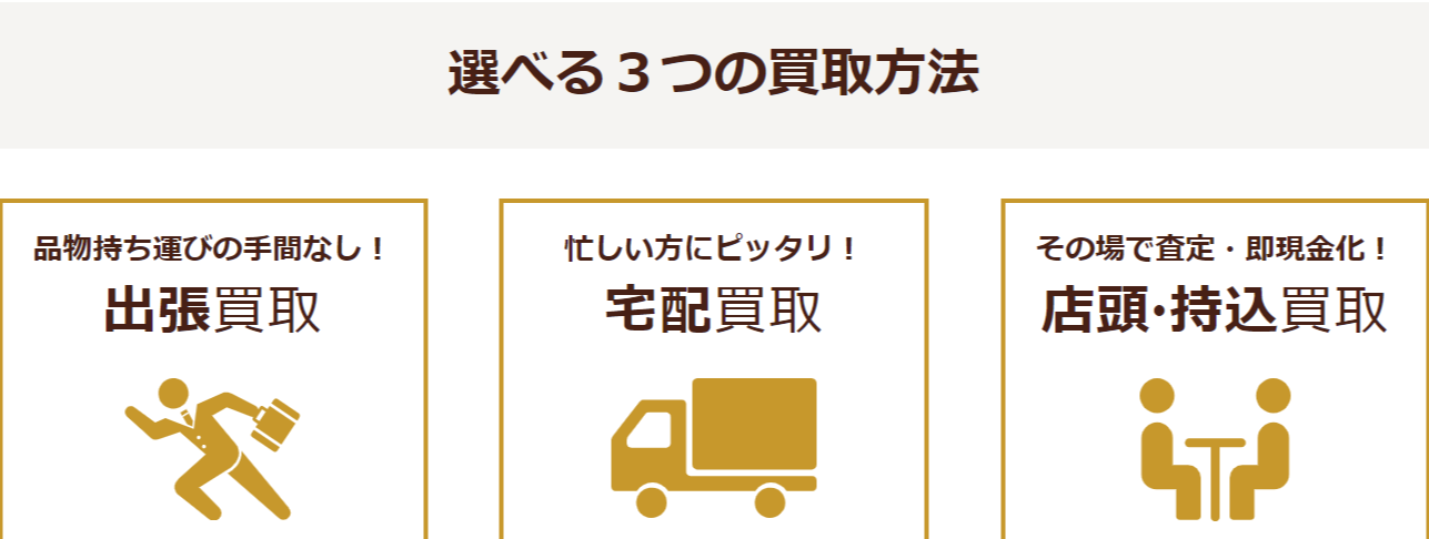 買取方法は「店頭買取・出張買取・宅配買取」の3種類で対応