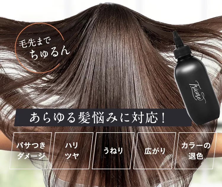 トリコレは髪の毛をサラツヤにする効果が期待できます。髪につけて揉みこむと液状からクリーム状に変化し、毛髪の1本1本に角質層まで浸透していきます。ダメージを補修し表面をコーティングすることで1本1本にサラツヤ感を与えます。