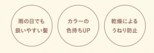 またアミノ酸やタンパク質の成分は水溶性のため、流出を抑えるためにシリコンでキューティクルの表面を保護。傷んだ髪の表面をコーティングし髪表面の保護や髪のからまりなどを防ぎます。