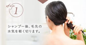 髪をシャンプーした後、軽く水気を切ります。水が滴っている状態だとトリートメント液がしっかり浸透しないので、水滴が流れない程度に水気を切った状態にします。