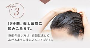 両手でなじませるように頭皮と頭髪に10秒間揉みこみます。配合成分が髪に反応し液状のトリートメントがクリーム状に変化し温感を感じられるようになります。髪の長い人は頭頂部にまとめるように上げると全体になじみます。また櫛などを使ってなじませると髪全体に行き渡ります。