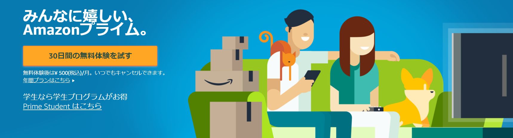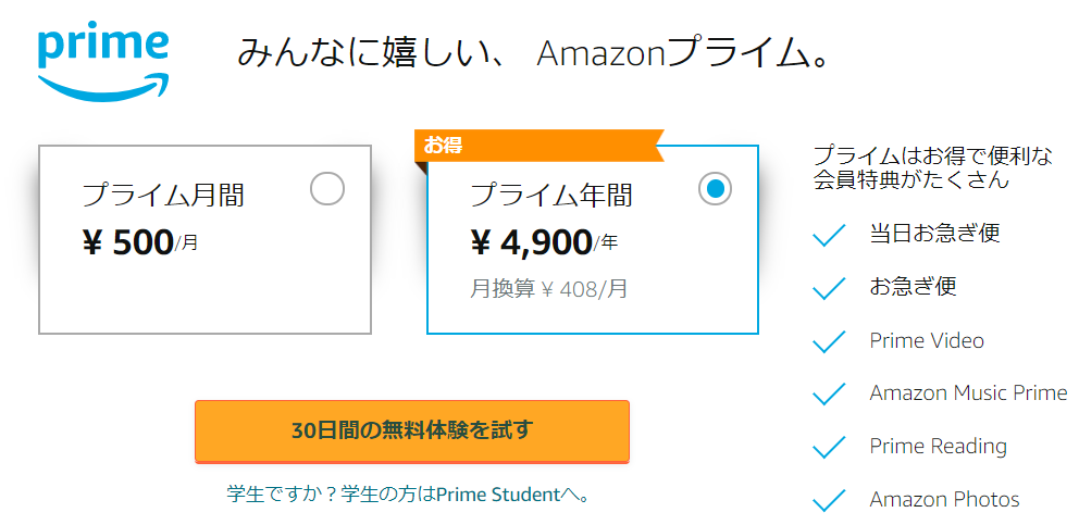 プライム会員は月額500円、年額4,900円で登録できるサービスです。30日間の無料体験もあるので初めて利用する方は特にお得に利用できます。さらに学生の場合は月額250円、年間料金が2,450円と一般よりも安い価格なのでおすすめです。
