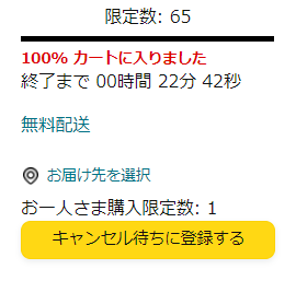 誰かかキャンセルすると通知が来るようになっている機能なので、キャンセルが出た時点で購入が可能になります。数量限定のタイムセールのみで使用できる機能なので知っておくと便利です。