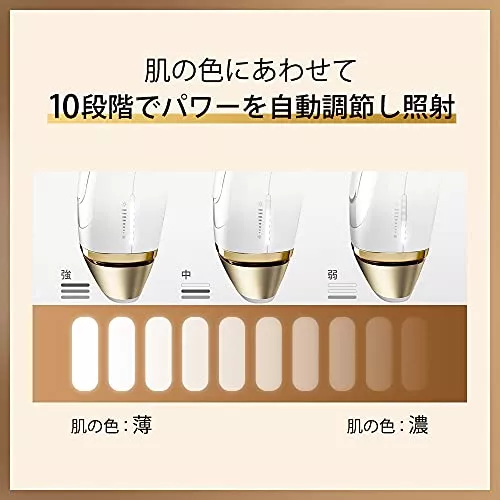 ブラウン脱毛器「シルクエキスパートPro5」には、自動で照射レベルを調節してくれる「自動調節機能」がついています。肌に当てるだけで機器が毎秒80回も肌色を読み取り、10段階のうち適切な照射レベルに自動で調節してくれる機能です。