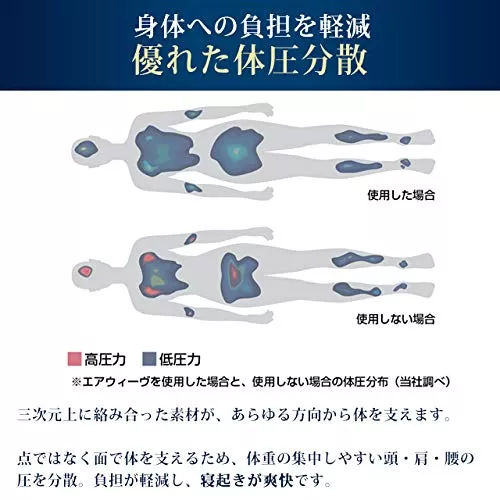エアウィーヴは独自素材のエアファイバーにより、優れた体圧分散機能を実現しました。さまざまな方向から体をしっかりと支え、体にかかる負荷をバランスよく分散し、仰向けでも横向きでも腰や肩の沈み込みを軽減し、朝までぐっすり眠れます。
