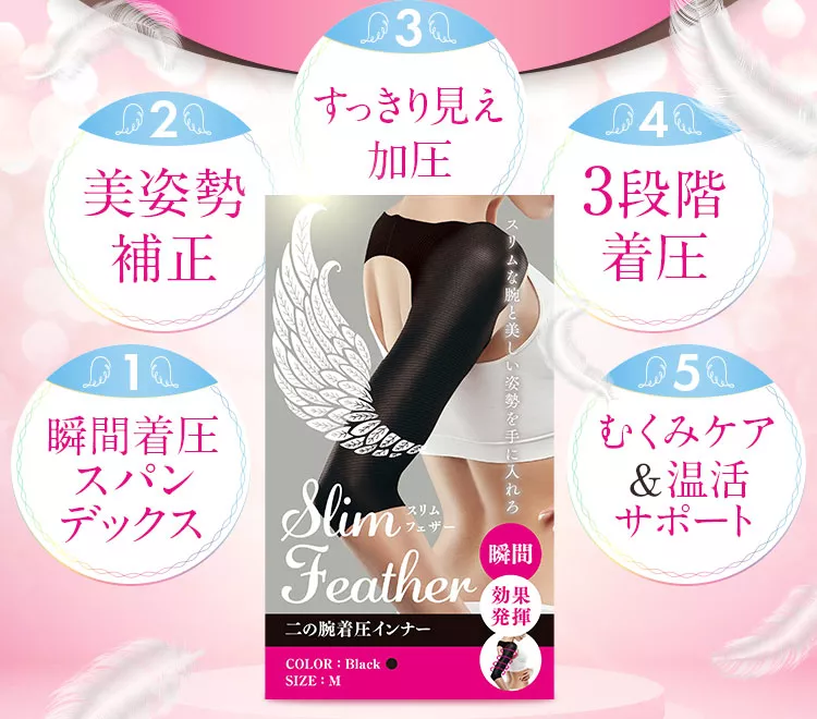 二の腕シェイパーとも呼ばれるスリムフェザーは、着るだけで360度、全方向からの3段階の着圧で二の腕を自然に引き締めてみせてくれます。