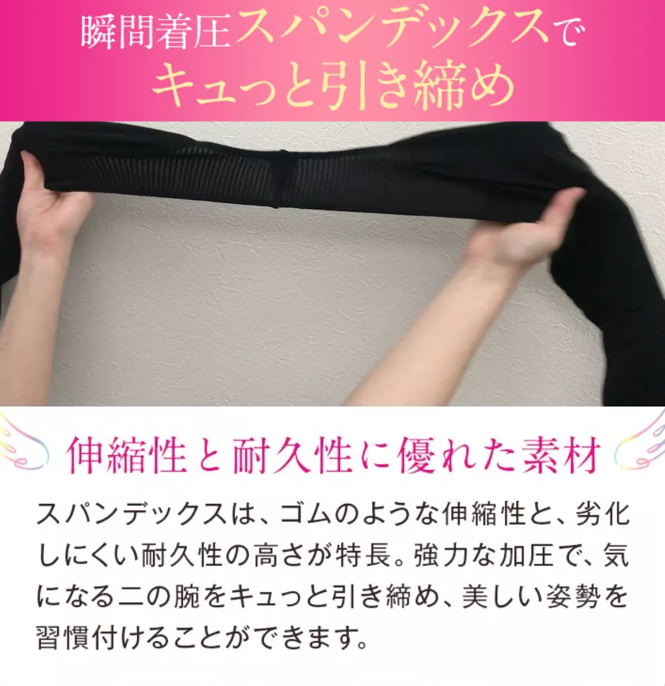 スパンデックスによる強めの加圧で、着けた瞬間から二の腕をスリムにみせてくれます。二の腕を360度全方向から効果的に加圧するため、上腕二頭筋だけでなく上腕三頭筋へもしっかりアプローチ可能です。