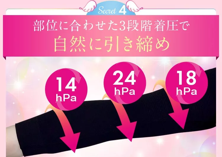 スリムフェザーには3段階の着圧が設定されています。加圧は、上腕が18hPa、肘の近くが24hPa、そして前腕は14hPaとなっており、各部位に適した着圧により、通常では鍛えにくい二の腕の筋肉を刺激する設計です。