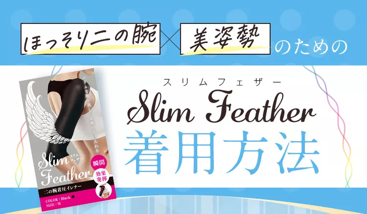 着るだけで、気になる二の腕を細く見せるだけでなく、美しい姿勢にしてくれるスリムフェザーは、上半身のバランスをアップさせて体調も整えてくれます。また、日常使用を続ければ、ダイエット効果も期待できる魅力的な着圧インナーです。