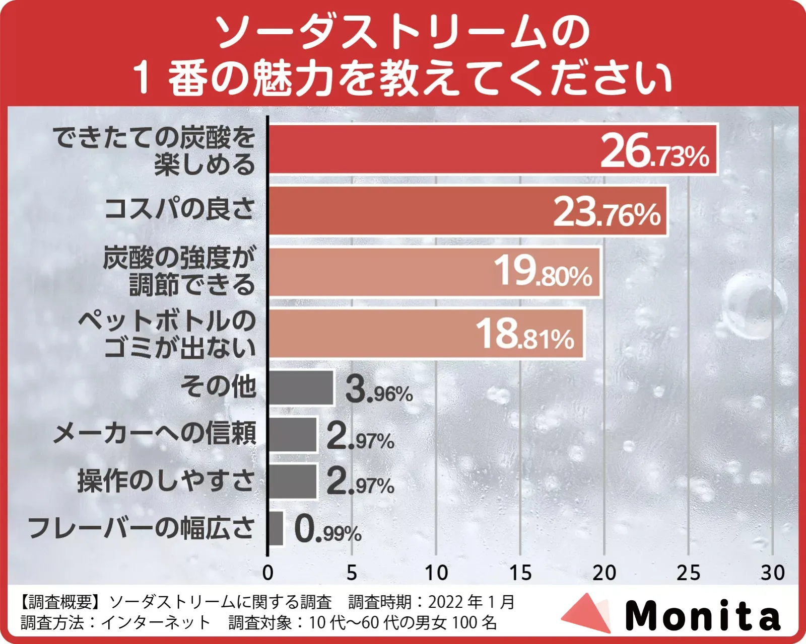 ソーダストリームの魅力に関するアンケート調査の結果、最も多かったのが「できたての炭酸を楽しめる」などの意見でした。そのほかにも「コスパの良さ」や「炭酸の強度が調節できる」など、市販の炭酸水にはない魅力があるようです。