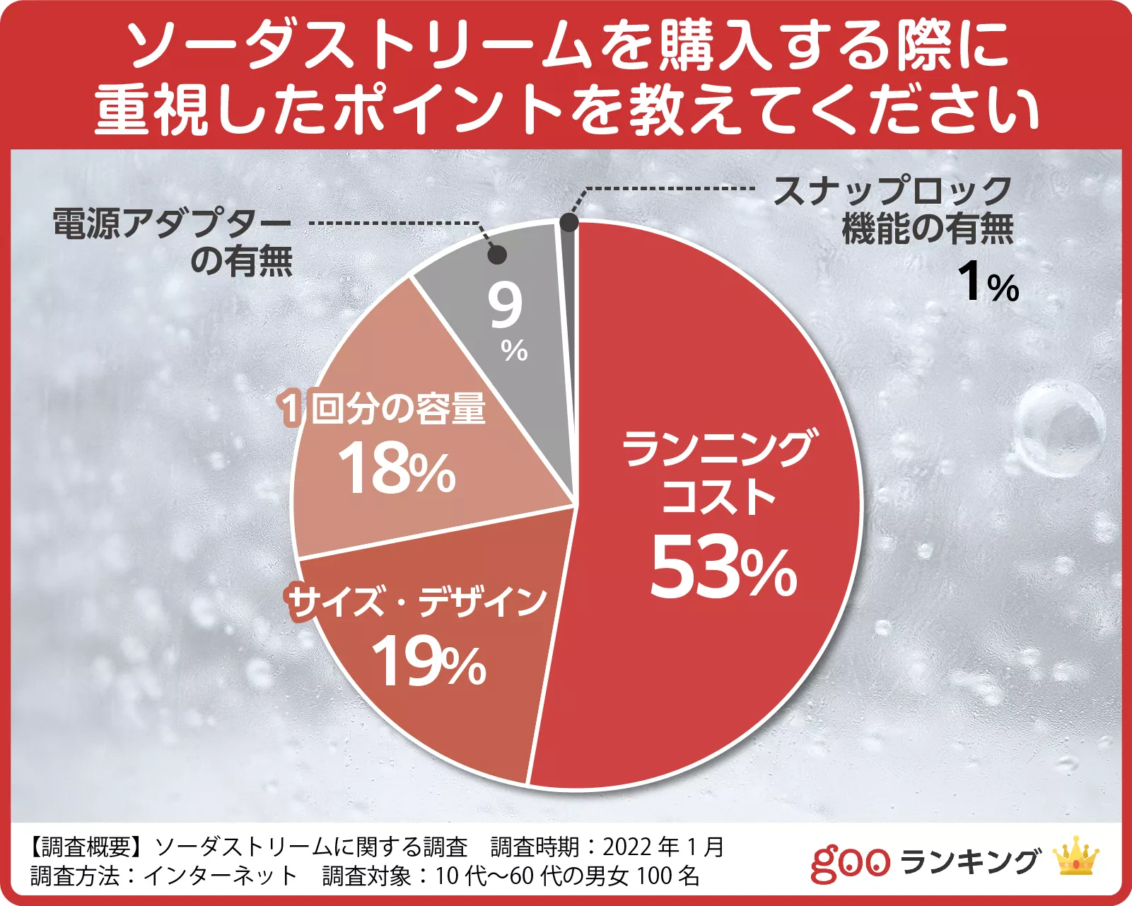 そこで今回は、ソーダストリームを購入した方100人にアンケートを実施し、おすすめ商品を調査しました。ランキングはランニングコスト・サイズ・デザインなどを基準に作成したので、ぜひ参考にしてみてください。