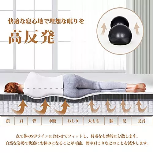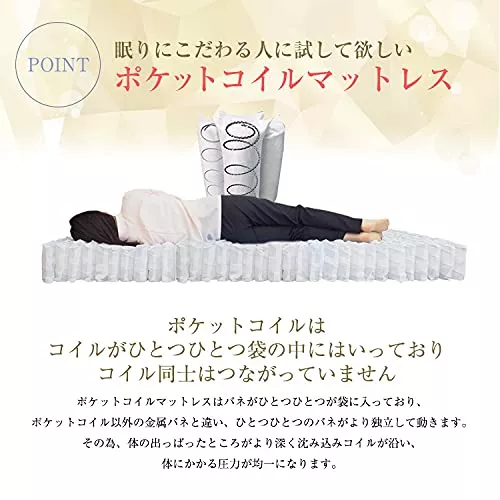 コスパの高いポケットコイルマットレスを探している方におすすめです。線径2.2mmのコイルを使用し、体の動きや寝姿勢に合わせてコイルが沈みます。コイルの上部には消臭効果の高高密度竹炭フォームを使用し、寝返り時もきしみ音が発生しません。