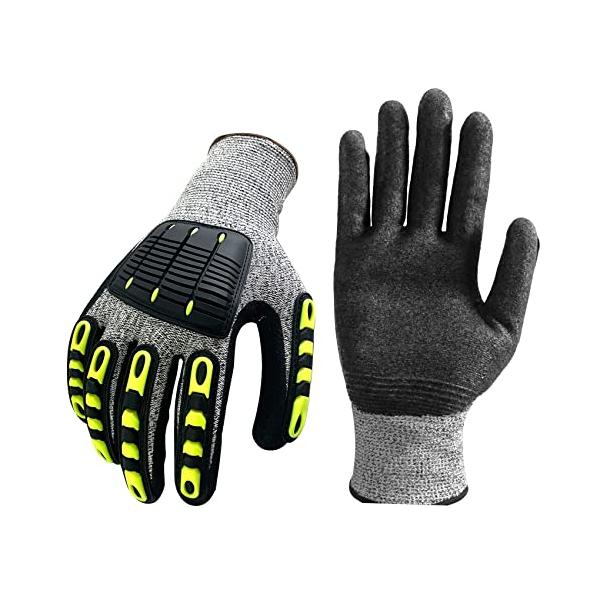 EN388の最高級5級テストに合格した防振手袋です。高密度ポリエチレン(HDPE)で編まれ、強度は普通の軍手の10倍以上、皮革手袋の4倍以上あり、しっかりと振動軽減します。手の甲に3D構造のPVC/TPRパッチを追加し、耐衝撃性も抜群です。