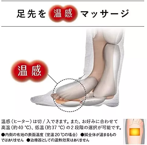 マッサージの強さは弱・中・強と3段階の切り替えでき、15分経過すると自動で電源オフします。足先を温めるあたため機能も搭載しているので、寒さが苦手な方にもおすすめです。