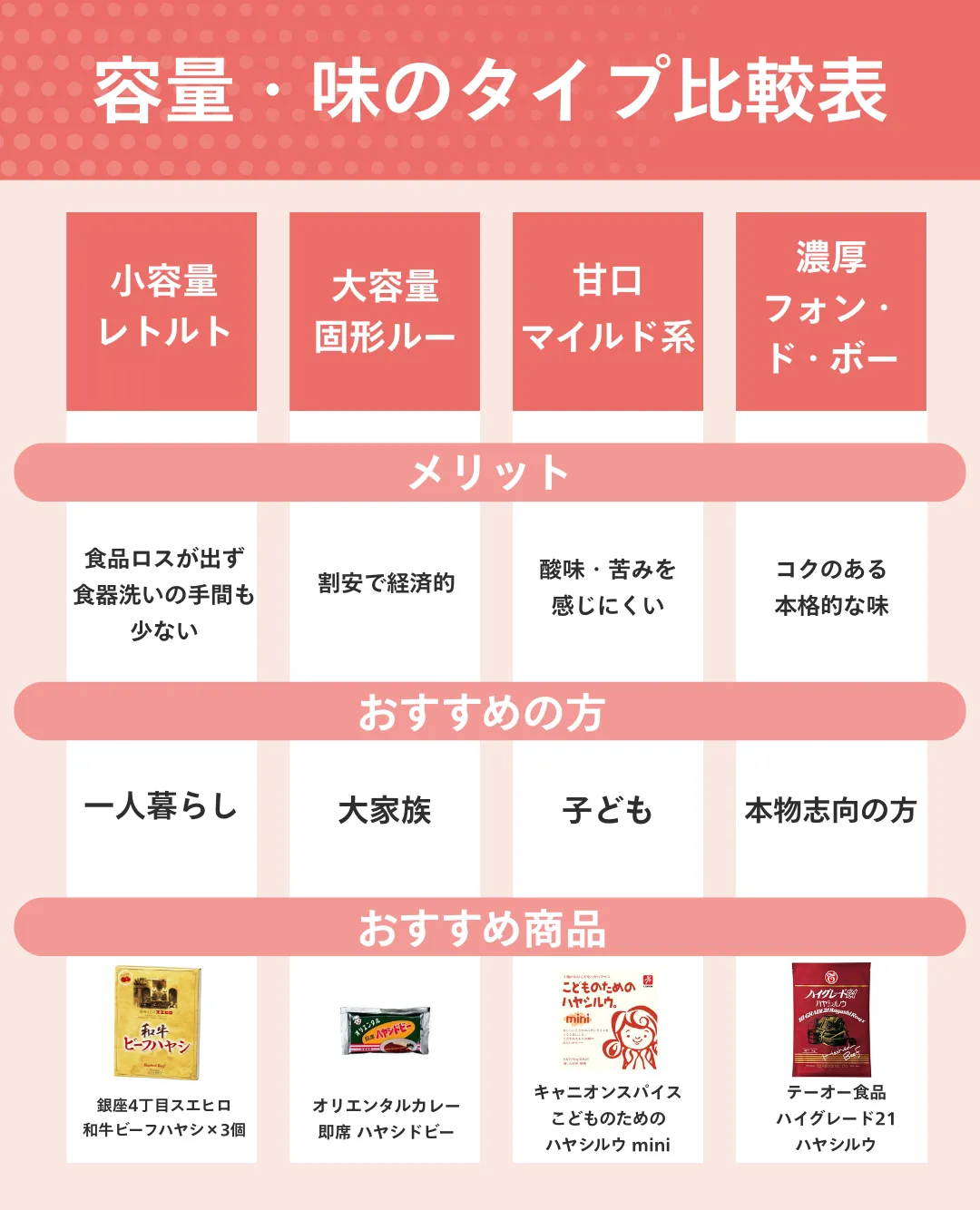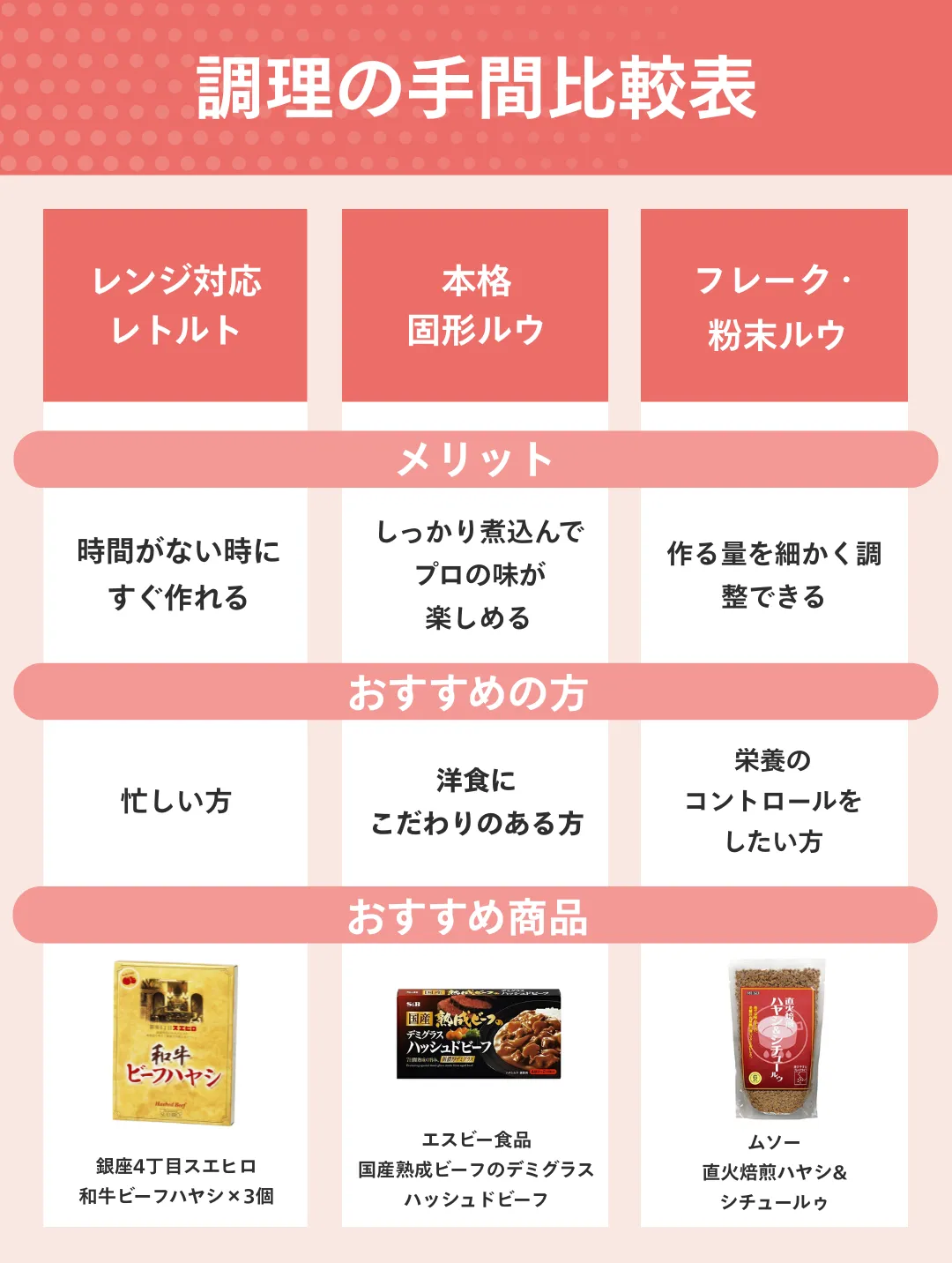 洋食にこだわりのある方や本格志向の方には、濃厚な味わいのものやフォン・ド・ボーを使用したものがおすすめです。赤ワインやフォン・ド・ボーのコクが強く感じられ、レストランのような本格的な味わいを楽しめます。「ディナーハヤシ」などが該当します。