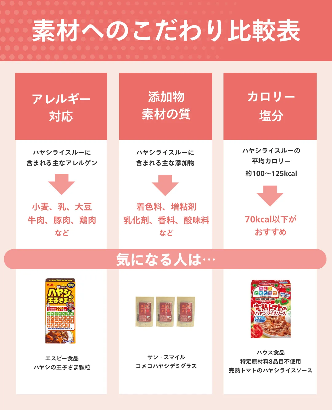 特定の食材にアレルギーがある場合は、必ずアレルギー食品表示をチェックしましょう。現在は小麦・乳不使用のものや、「特定原材料不使用」を明記したハヤシライスルーも販売されています。