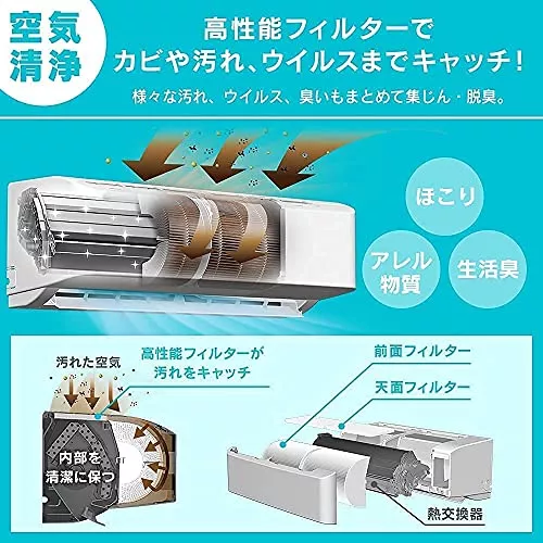 空気中の有害物質を効率的に除去する高機能フィルターを備えているエアコンです。ウイルス・カビ菌・細かな粉塵をしっかりと捕らえ、内部を清潔に保ち掃除の手間を軽減します。また、全方位に動くルーバーが室内の隅々まできれいな空気を届けます。