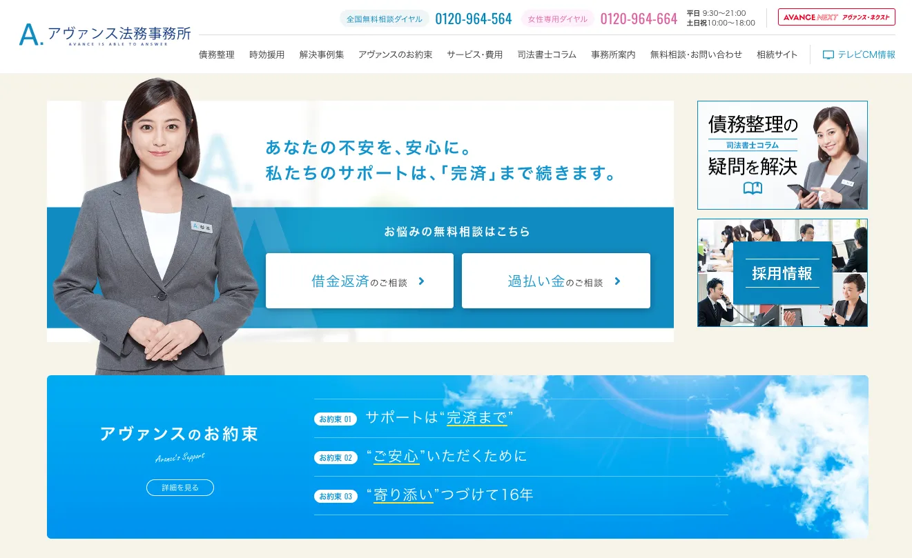 アヴァンス法務事務所は、過去10年で23万件以上の相談実績があります。任意整理後の返済までバックアップしてくれるのでサポート重視の人にもおすすめです。