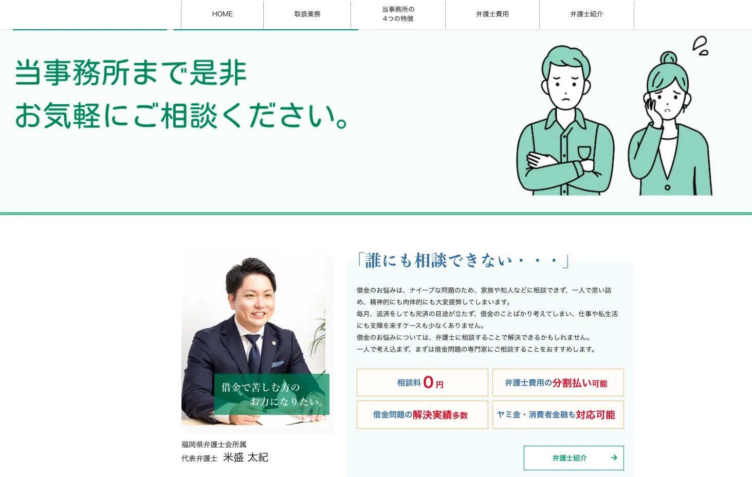 債務整理でお世話になりました。 仕事や生活面で精神的にきつくなり借金が増え、返せなくなってどうしようか悩んでいた時に米森法律事務所の口コミやサイトを拝見して相談させて頂きました。 初めての債務整理で分からないことも多く不安でしたが、米森先生はじめスタッフの方の丁寧で分かりやすい説明と相談がしやすい雰囲気、こまめに連絡して頂きとても安心しました。 今回、米森法律事務所に相談・対応して頂けて本当に良かったです。これからの人生前向きに頑張っていこうと思います。 米森先生、スタッフの皆様、この度は本当にありがとうございました。