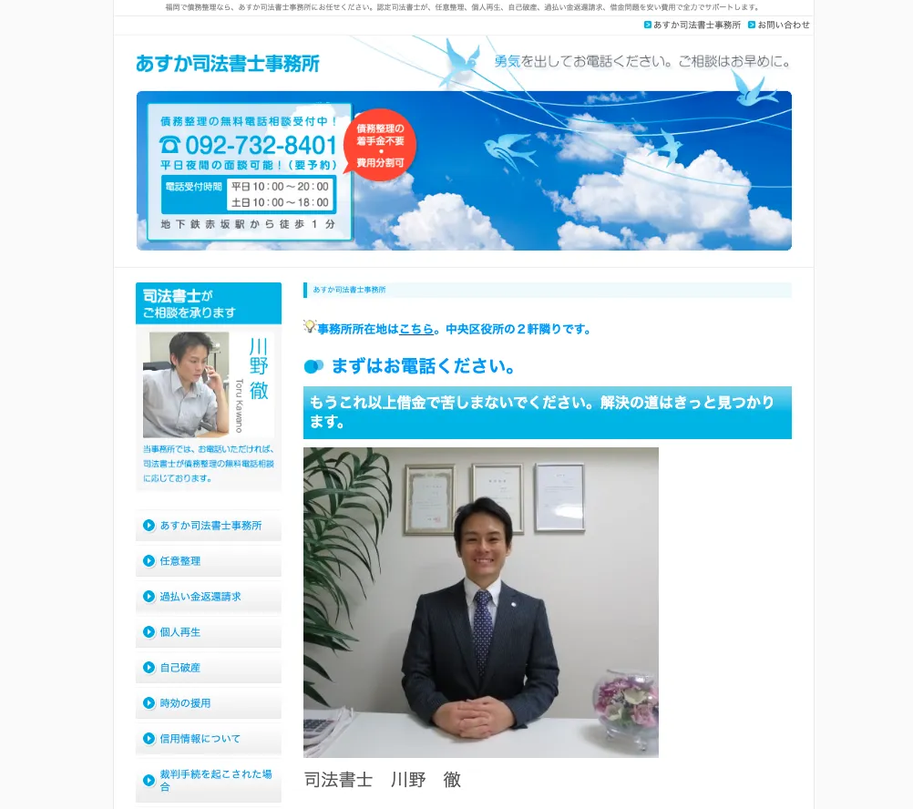 私は借金がありまして色々な弁護士の方の所へ訪問し今の状況やそれにかかる費用などのご相談をしてきました。何人も話していく中であすか司法書士 川野様が1番親切にお話しを聞いてくれて そしてどこの場所よりも金額を安くしてくれて そして借入した消費者金融と川野様のやり取りで借金を大幅に減らして頂き無事借金も終わることになりました。 このあすか司法書士事務所に来たことで出会えた事で本当にこれからの人生が大きく変わりそうです。 何もかもあすか司法書士川野様のおかげだと。本当に感謝の気持ちでいっぱいです。 ここだからこそこの人だからこそ今の自分があると思います。 本当にありがとうございました。