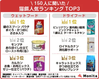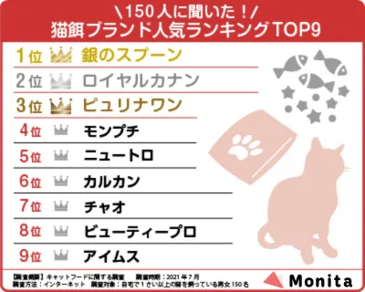 アンケートではおすすめの市販猫餌に加えて、人気の猫餌ブランドや猫餌選びで重視するポイントについても調査し、1番人気はユニ・チャーム ペットの「銀のスプーン」でした。美味しさにこだわった、猫ちゃんの食いつきのいい猫餌が多いのが魅力です。
