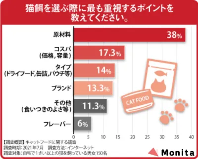 猫餌選びで最も重視されていたのは「原材料」で38%で健康に長生きしてほしいからこそ、安全性の高い猫餌を選んであげましょう。また原材料は、栄養分にこだわりたい方にも欠かせないポイントになります。食いつきのいい総合栄養食を見つけてあげてください。