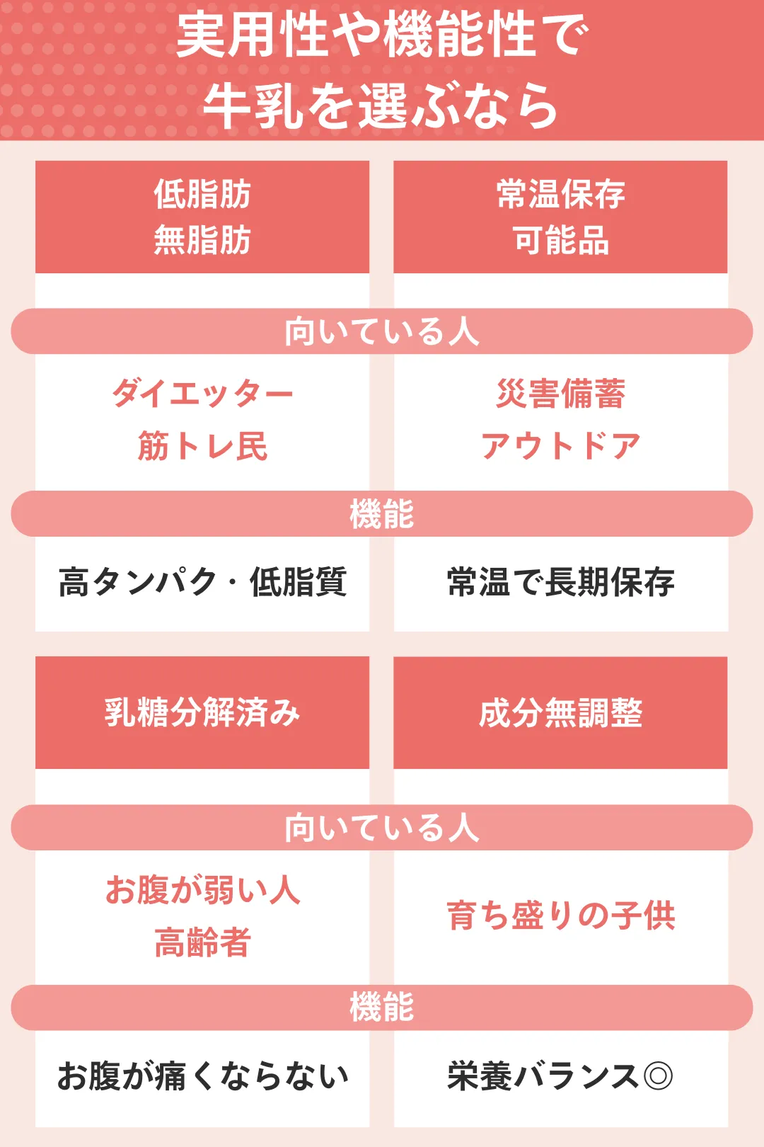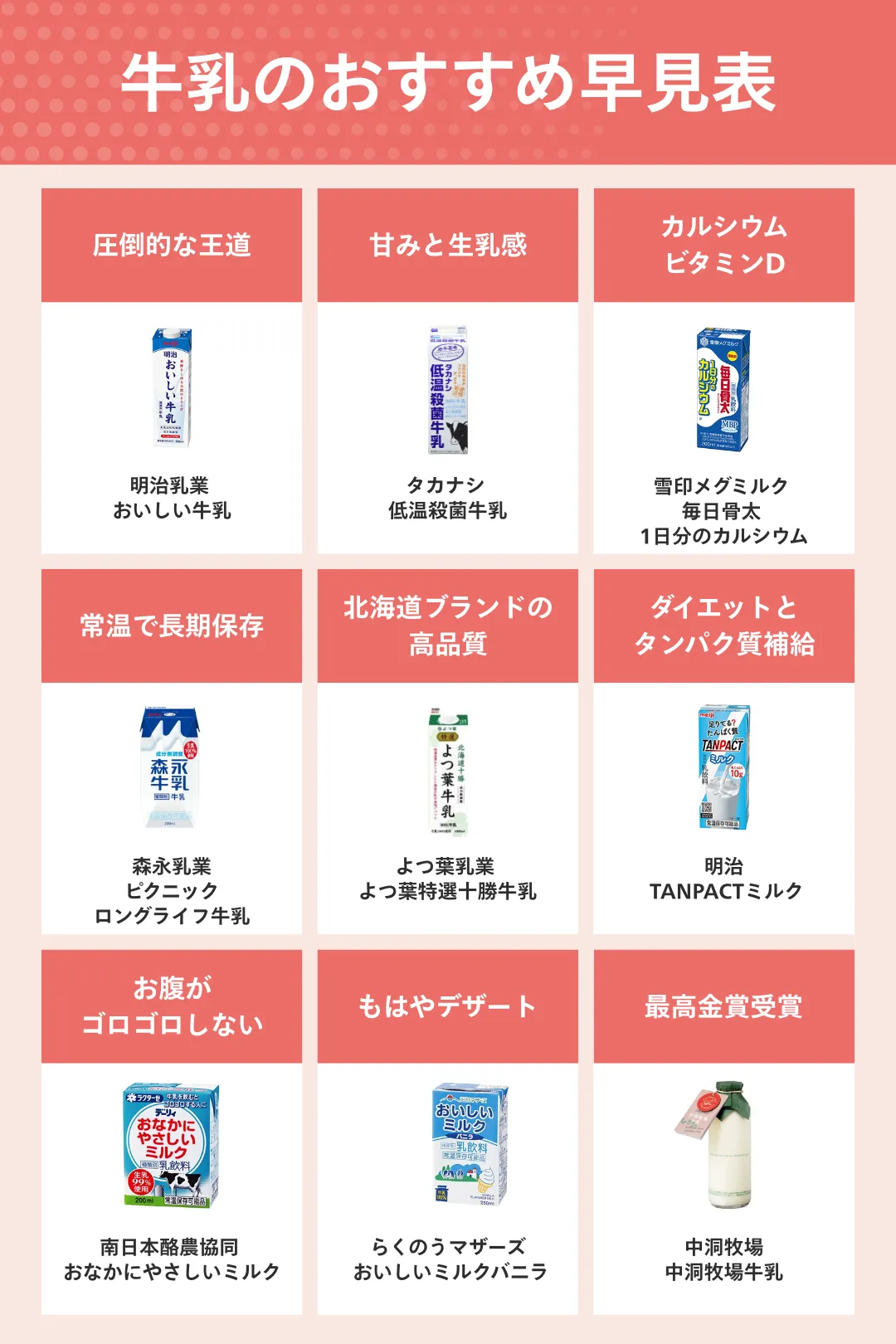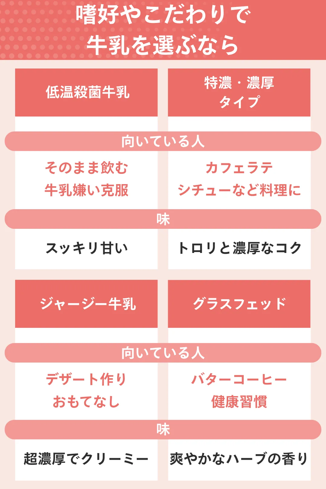牛乳はスーパーなどで買える市販品でも、鉄分やカルシウムを補強するものや、コクを感じられる濃厚な高級牛乳・低脂肪牛乳・生まれてから1歳程の赤ちゃん用の安全な牛乳など、たくさんの種類が販売されています。