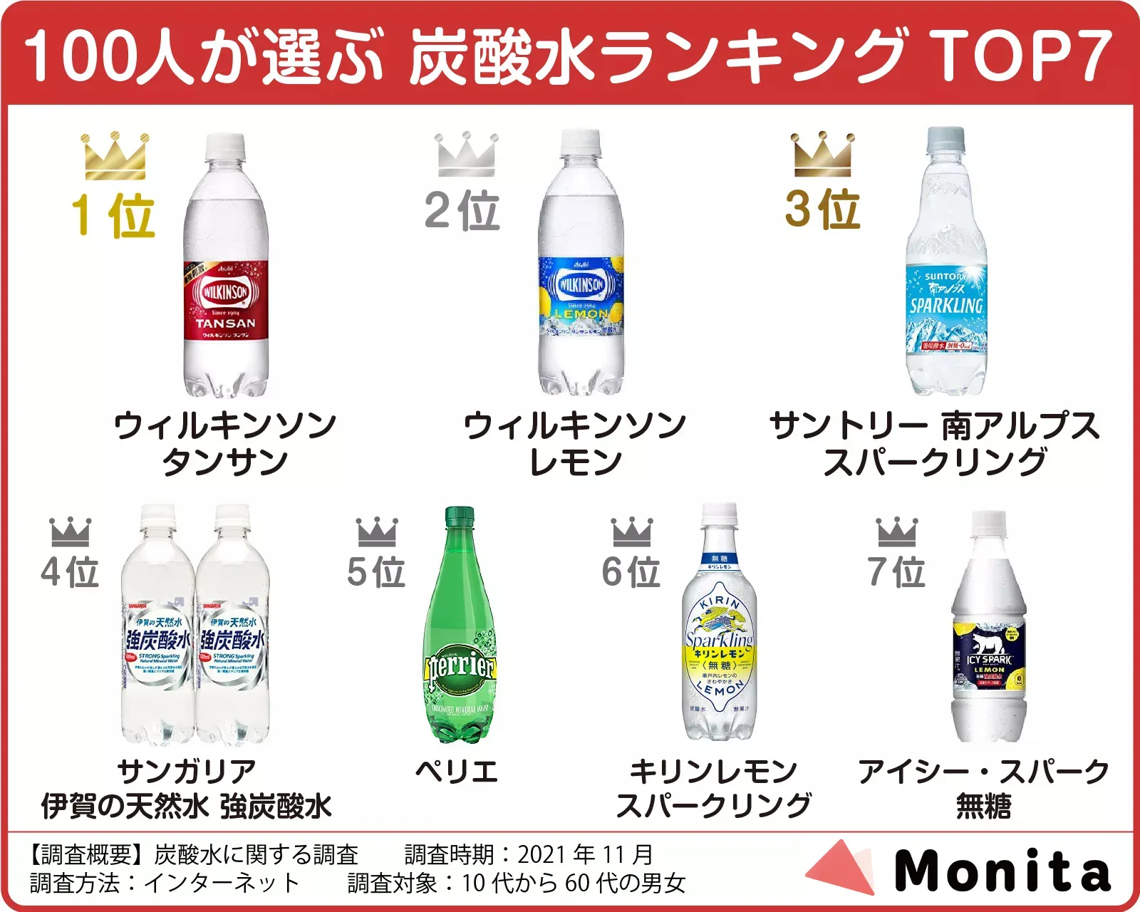 普段から炭酸水を飲んでいる炭酸水好き100人に「いちばんおすすめの炭酸水」を選んでいただき、得票数を元にランキングを作成しました。ぜひ参考にしてみてください。