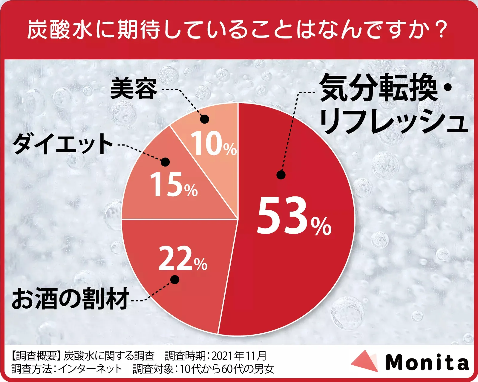 また、炭酸水に期待しているポイントもあわせて調査したところ、「気分転換・リフレッシュ」の回答が半数以上を占める結果になりました。炭酸水の「のどごしの爽快感」がリラックスに効果的なようです。