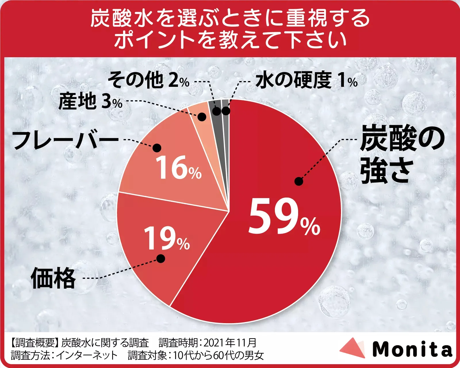 はじめに、炭酸水を選ぶ際に重視しているポイントを調査しました。アンケート調査の結果、「炭酸の強さ」「価格」「フレーバー」が重視されているようです。炭酸の強さは人によって好みが異なるため、忘れずにチェックしたいポイントといえます。