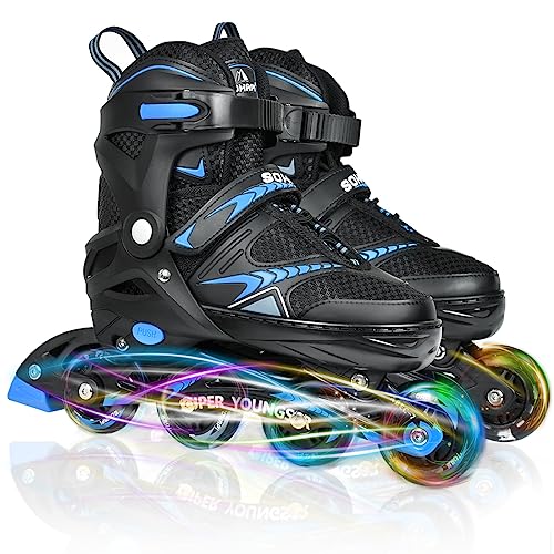 S(19〜21cm)からXL(26.5〜28.5cm)までの4サイズ展開で、プッシュボタンによる簡単なサイズ調整が可能です。滑走時に自動で点灯するLEDホイールは、電池不要で視認性と楽しさを兼ね備えています。