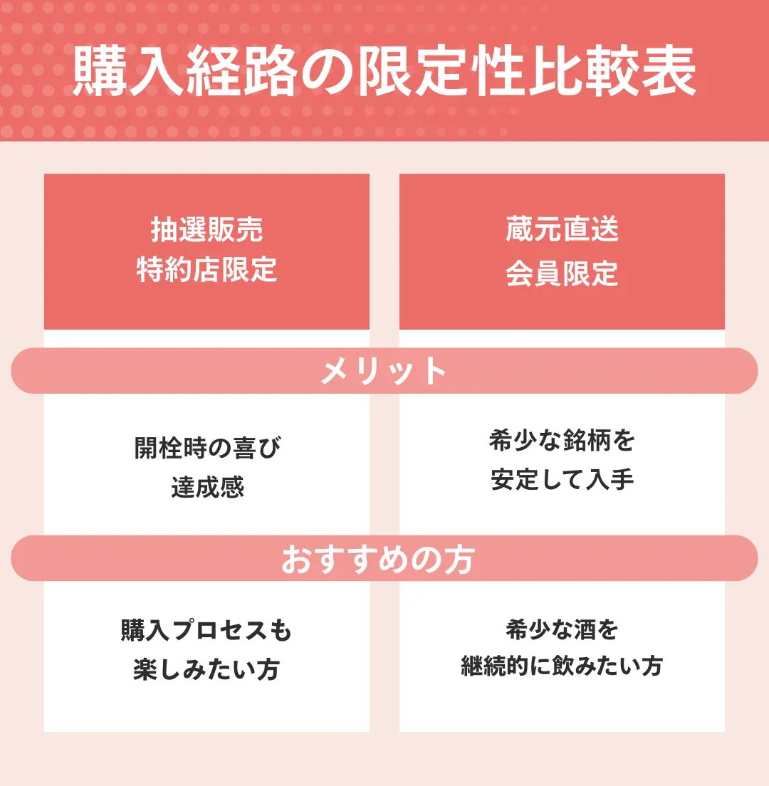 本当に希少な酒を継続的に飲みたい富裕層や愛好家には、蔵元直送や会員限定販売は非常に有効な手段です。一般市場で高騰するプレミア価格を避けて、定価に近い適正価格で安定的に銘柄を入手できます。