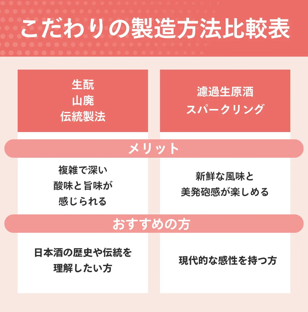 時間と労力を惜しまない伝統製法は、蔵元の技術力と哲学の結晶であり、現代の日本酒がどのように進化してきたかを物語ります。一口ごとに発見があるため、日本酒の奥深さを知りたい方におすすめです。