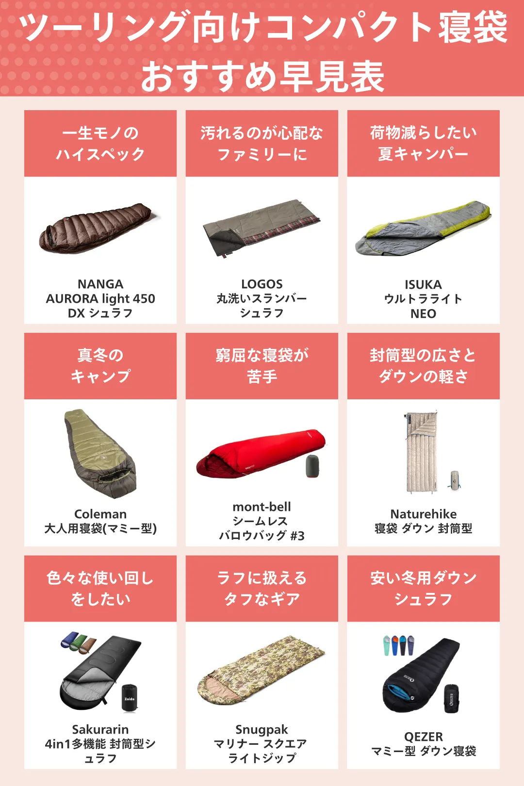 ツーリング向けコンパクト寝袋は「何を重視するか」を明確にすることで、自分に合った一本が選べます。ツーリング向けコンパクト寝袋選びでチェックすべきポイントは、