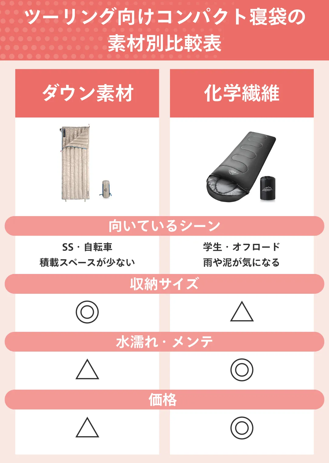 SSや自転車など積載スペースが限られるツーリングでは、ダウン素材が最強の武器になります。化繊に比べて圧縮率が圧倒的に高く、収納サイズは半分以下になることも珍しくありません。