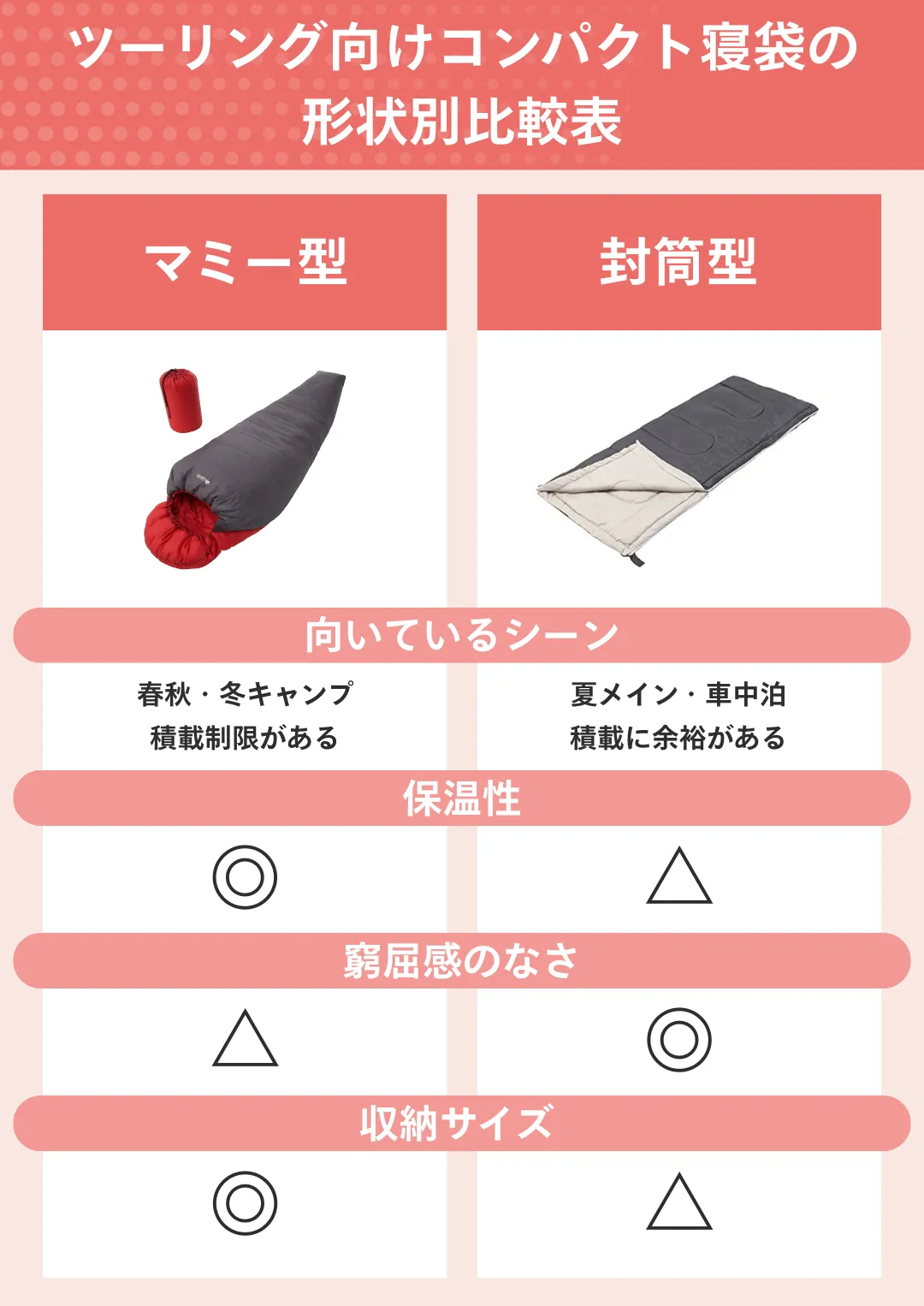 - 寝心地(封筒型)と保温性(マミー型)のどちらをとるか