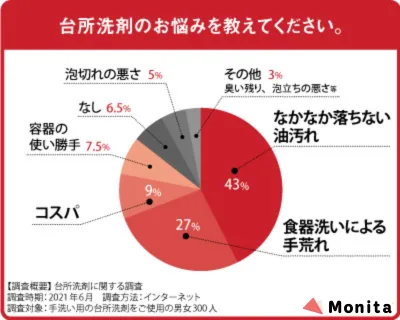 アンケートで台所洗剤の選び方をうかがったところ、「除菌力」を求める声が約3割もありました。こんなご時世だからこそ、食器の除菌までしてくれる洗剤は心強いです。一方、台所洗剤のお悩みとして1番多く上がったのは、「なかなか落ちない油汚れ」でした。