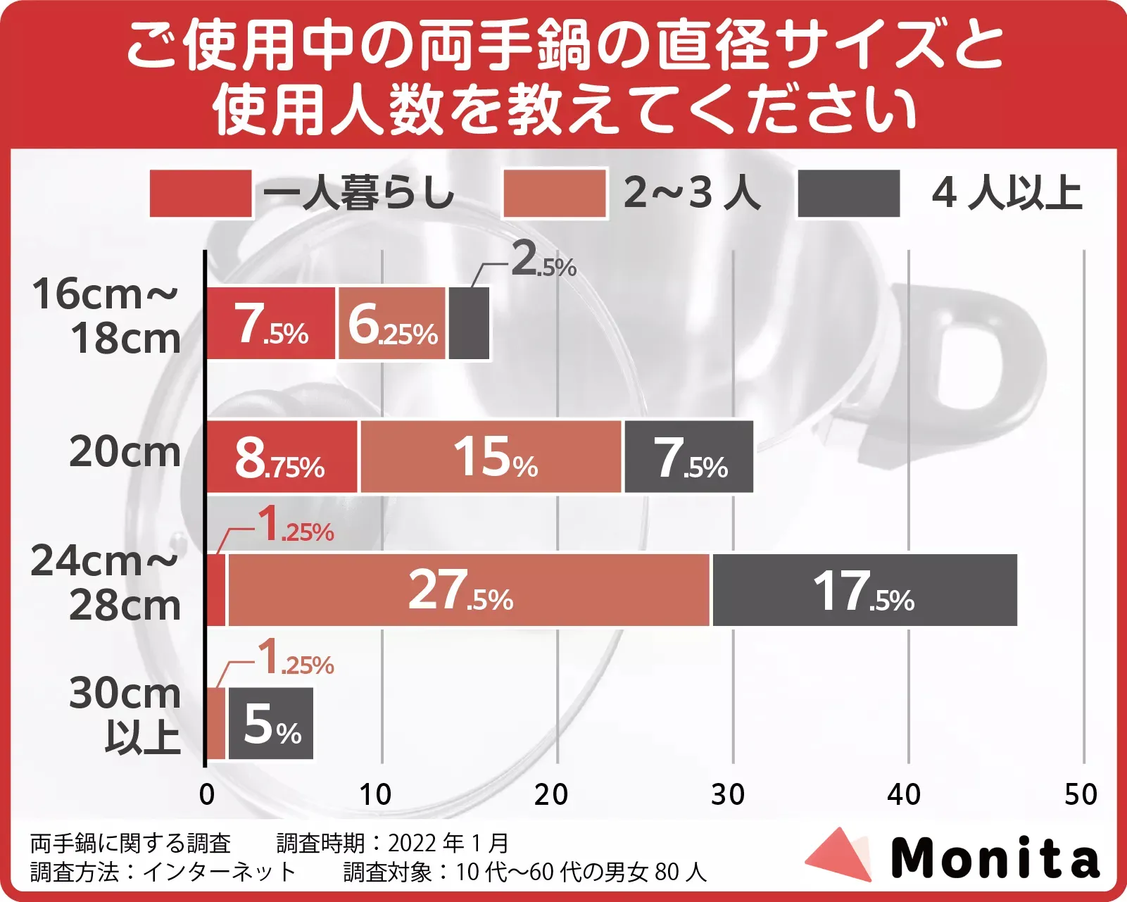 アンケートでは、家族の人数と鍋のサイズについても調査を行いました。その結果、一人暮らしでは16cm~18cm・2~3人暮らしでは20cm・4人以上の家庭では24cm以上の両手鍋を使用している回答者が多かったです。