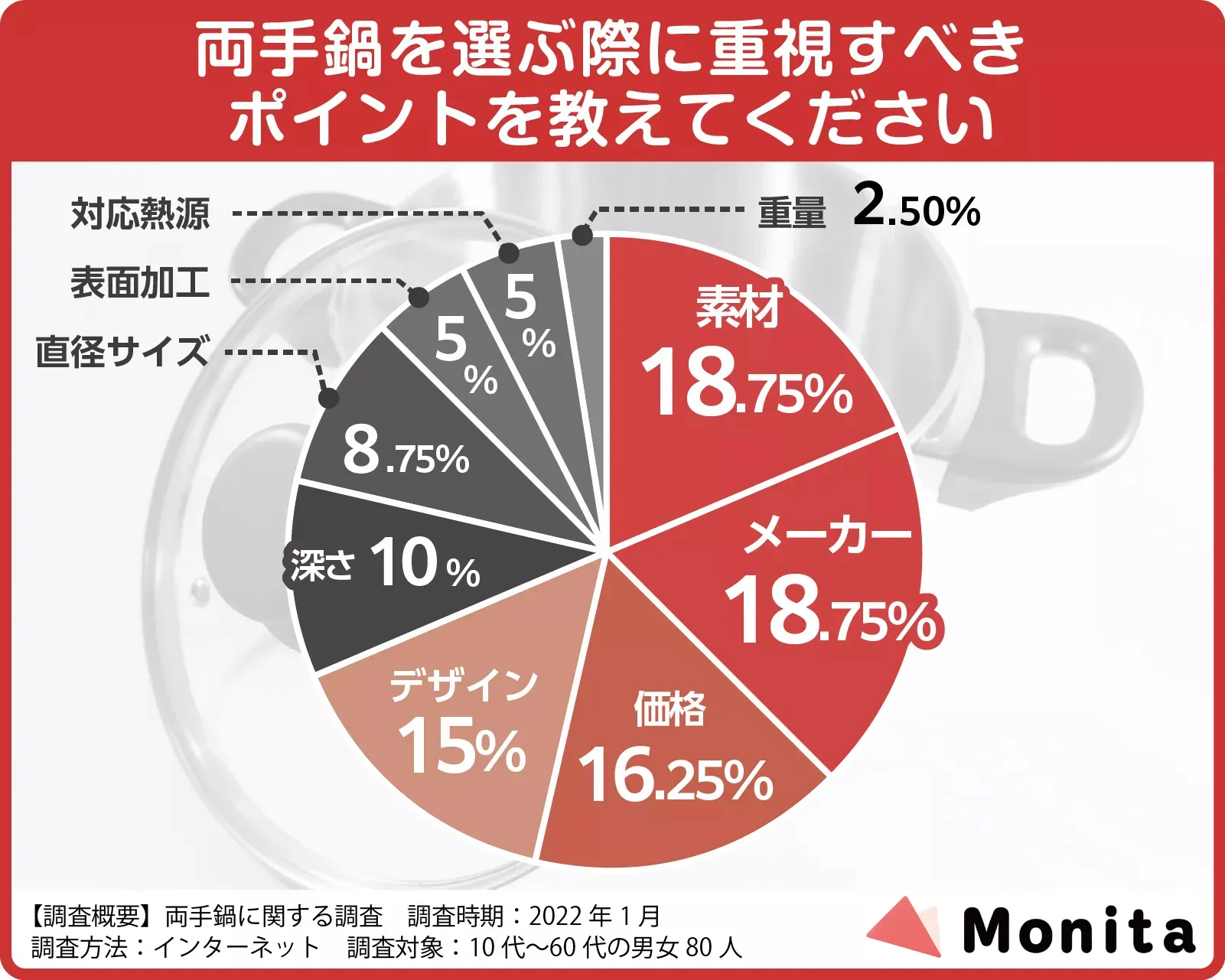 アンケートで1番多かった回答は、18.75%で素材でした。両手鍋にはステンレスやアルミなど、さまざまな素材のものがあります。素材によって調理時間やお手入れのしやすさが変わってくるので、商品を選ぶ際は調理する方の好みに合わせた素材を見極めましょう。