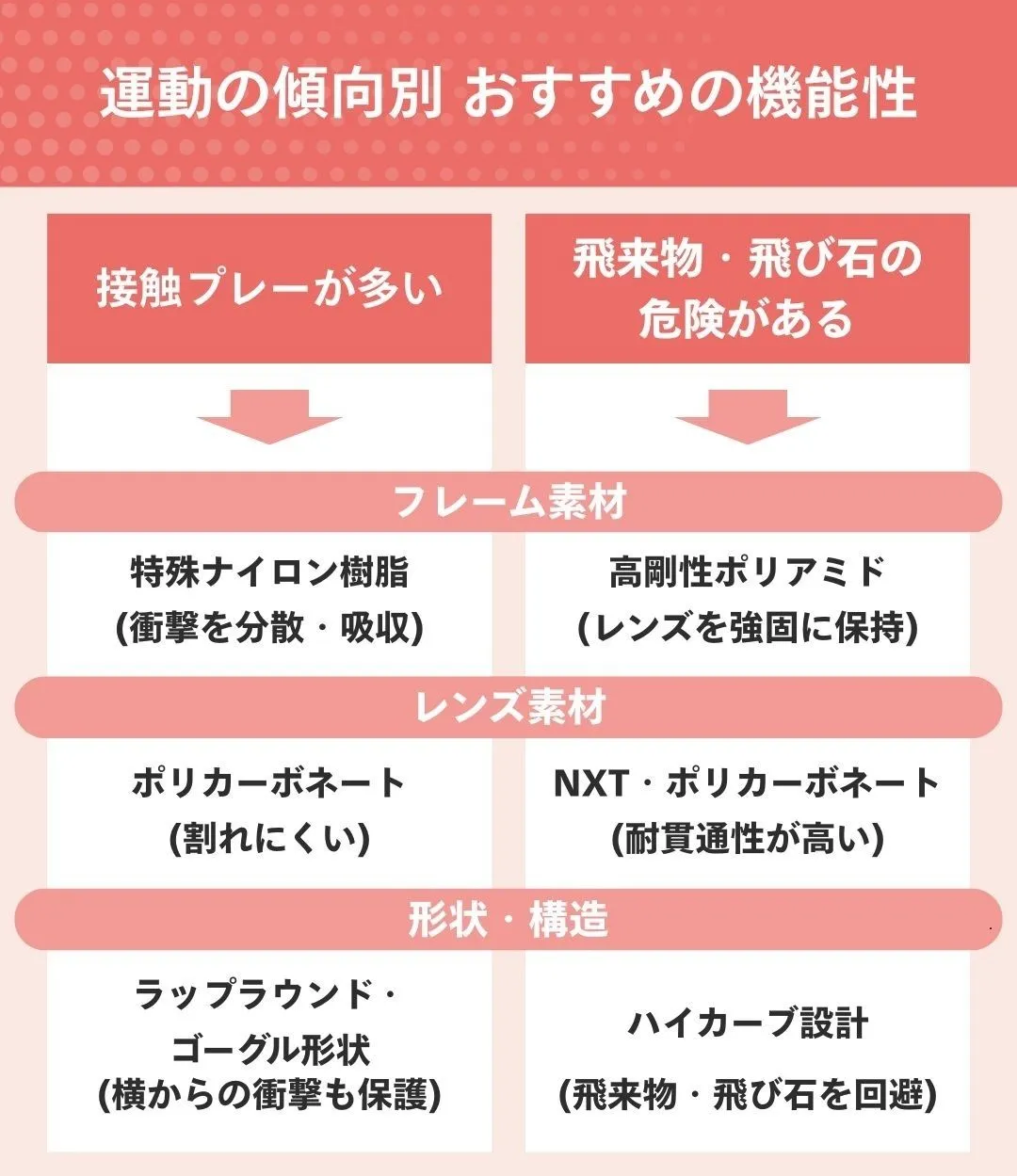 バスケットボールやサッカーといった身体接触が頻繁に発生する競技では、顔面への衝撃を想定した設計が不可欠です。ポリカーボネートや特殊なナイロン樹脂を用いたフレームは、強い衝撃を受けても折れにくく、万が一の破損時にも破片が飛び散りにくい特性を持っています。特に、顔の形に沿ったカーブを描くラップラウンド形状は、広い視界を確保するだけでなく、横からの衝撃に対しても高い防御力を発揮します。