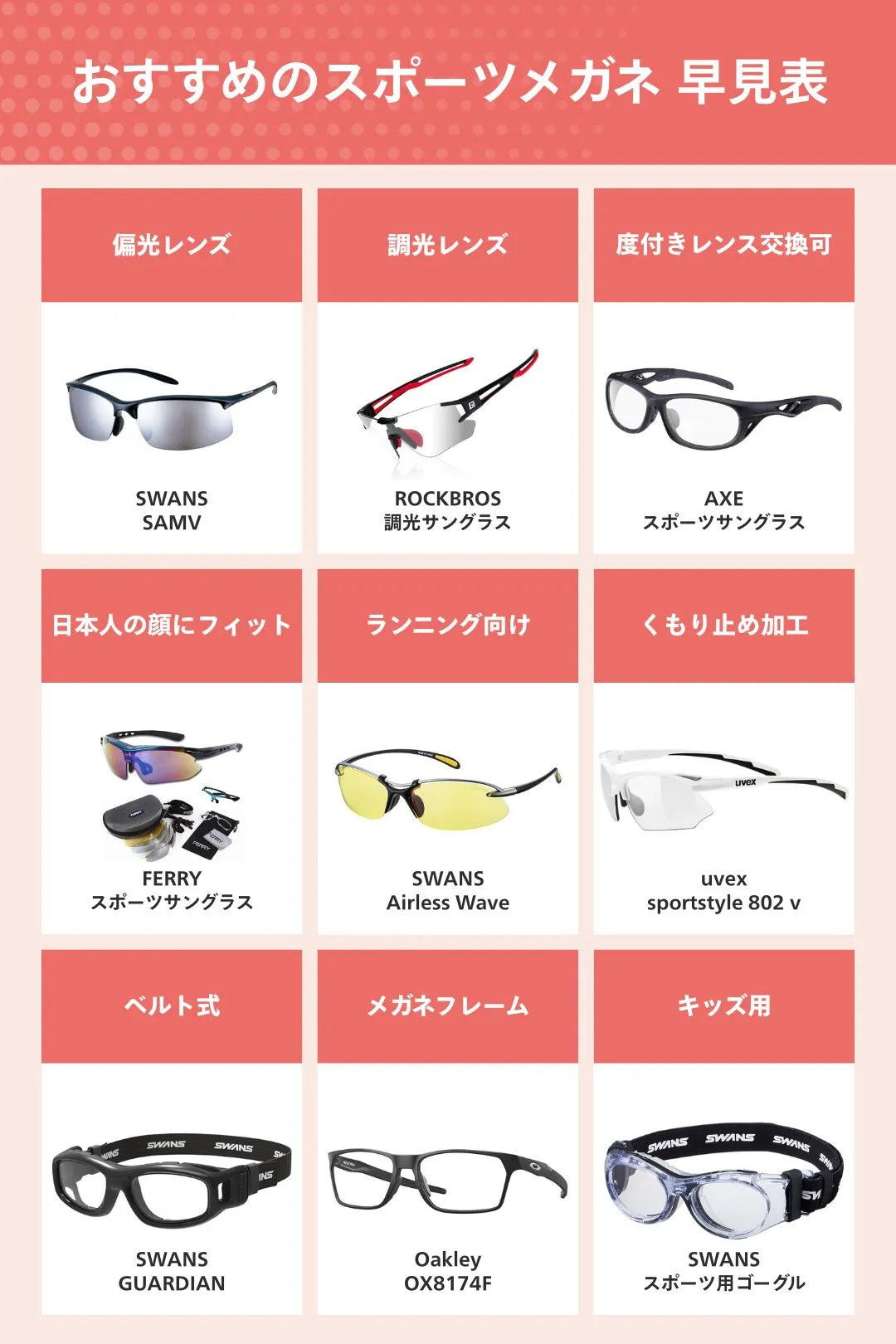 実はひと口にスポーツメガネといっても、普段使いできるおしゃれなものや度付きタイプ・子供用・大人用などさまざまな商品があります。JINSやZOFF・眼鏡市場などのメーカー・店舗で展開されているので、どれを選べばいいか迷ってしまいますよね。