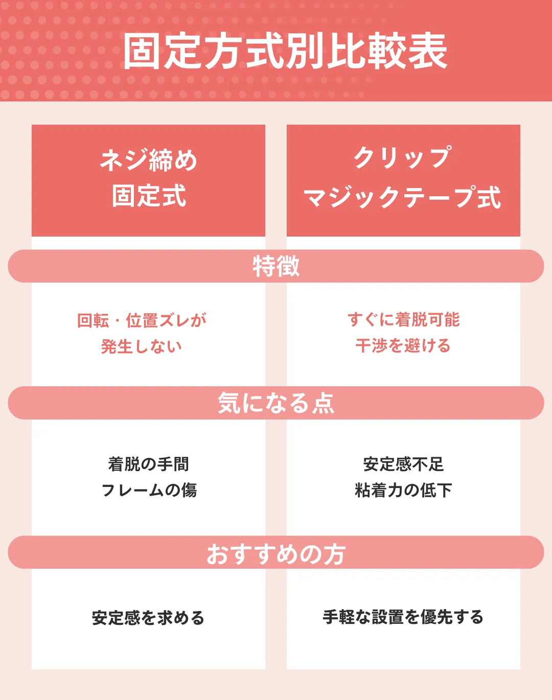 着脱の頻度が高く手軽な設置を優先したい方はクリップ・マジックテープ式
