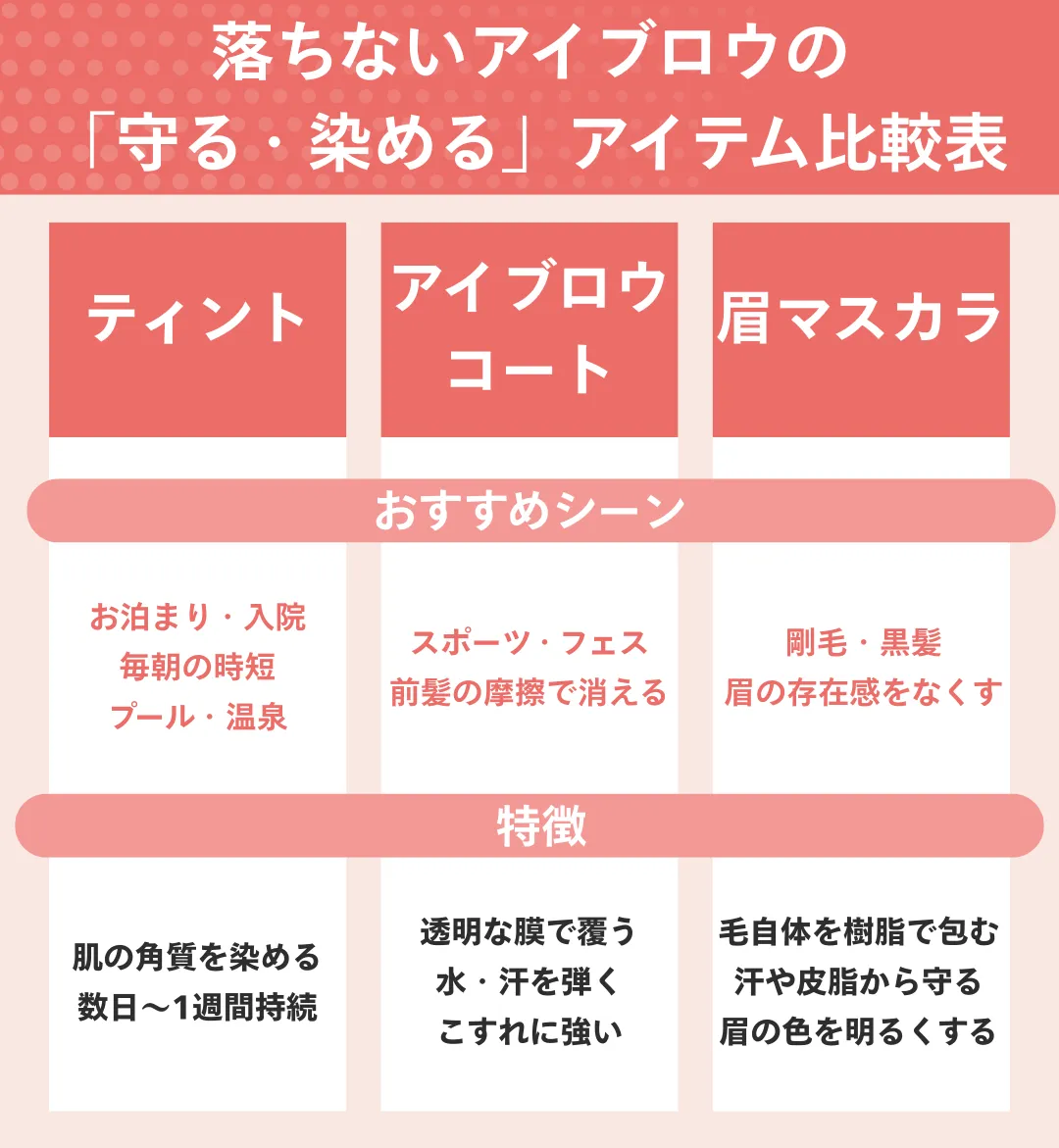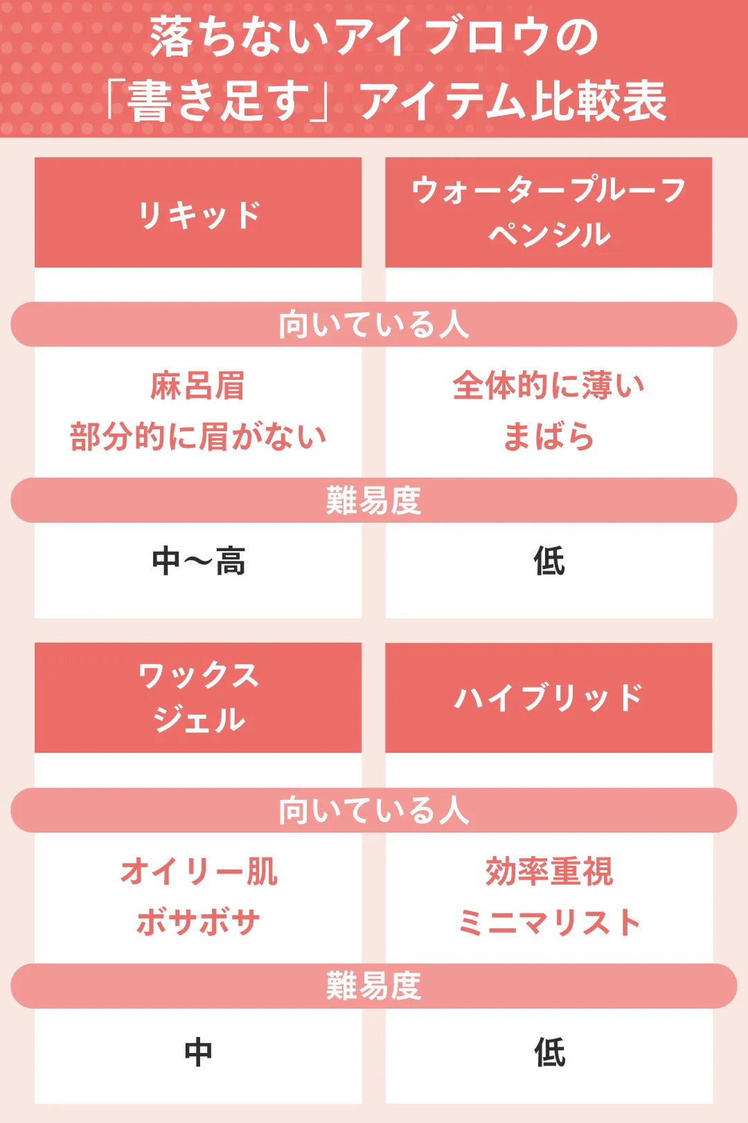 「すっぴんでも眉を残したい」「ジムやプールで思い切り楽しみたい」などの使用シーンを明確にすると、選ぶべきアイテムは自然と絞られてきます。
