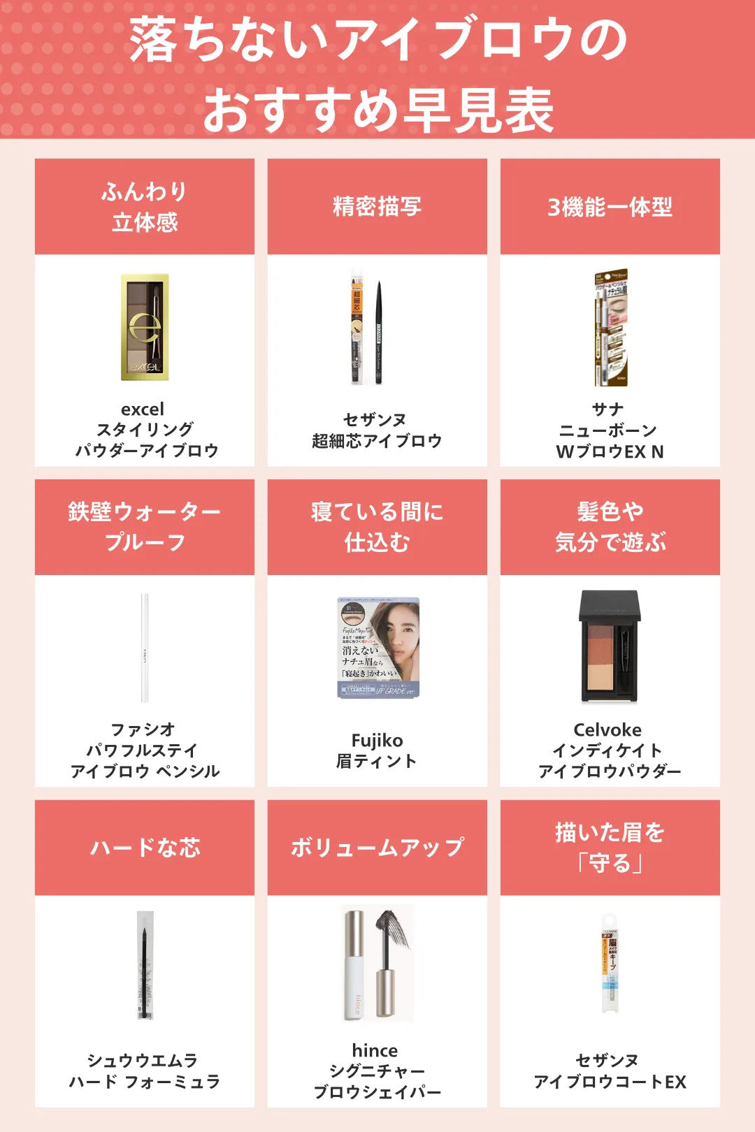 タイプ別・落ちないアイブロウの人気おすすめランキングをご紹介しました。1日経っても落ちないアイブロウはとても便利なアイテムです。今回のランキングを参考に、ぜひ自分に合ったアイブロウを探してみてください。