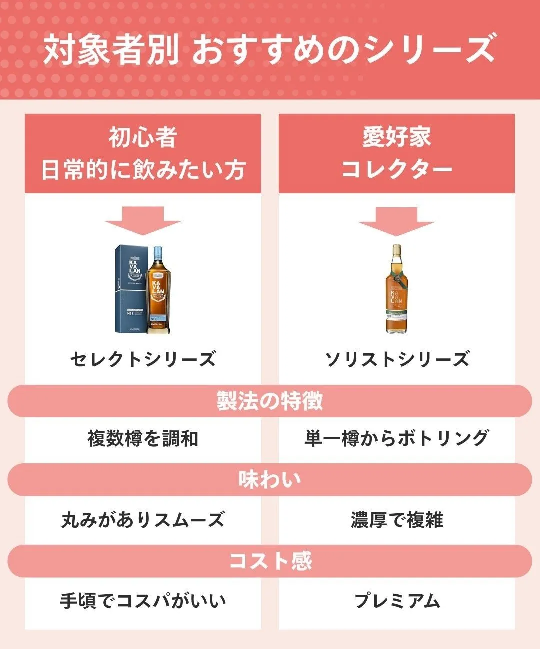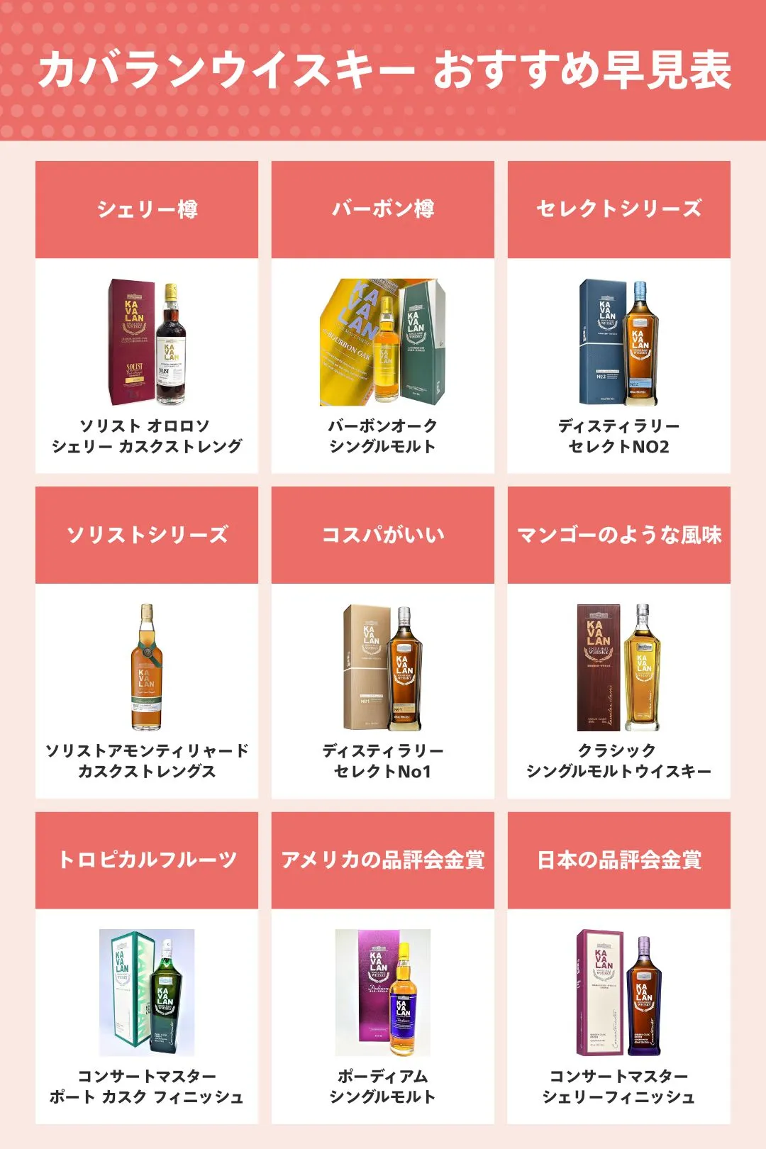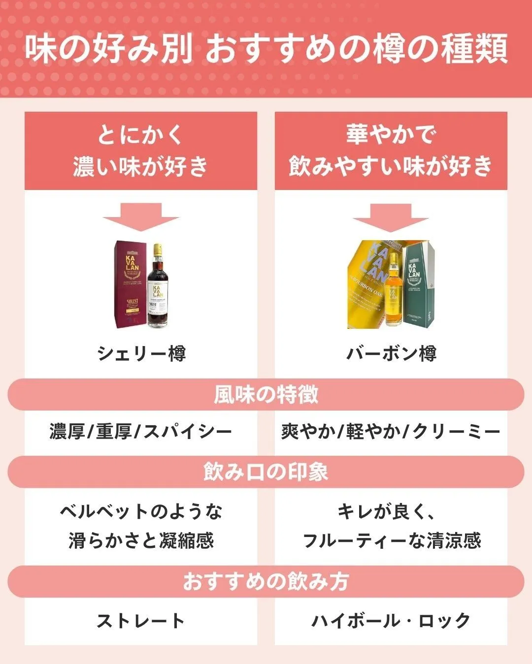 まずは伝統的なスコッチとは異なる、台湾ならではの樽使いによる個性の違いを理解し、お気に入りの系統を見つけることから始めましょう。