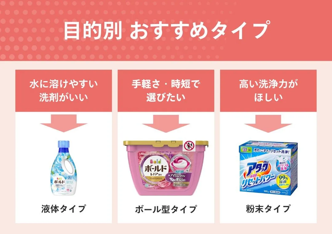 洗剤のタイプは液体タイプ・ボール型タイプ・粉末タイプの3種類あります。それぞれ特徴が異なるため、目的に合わせてタイプを選びましょう。
